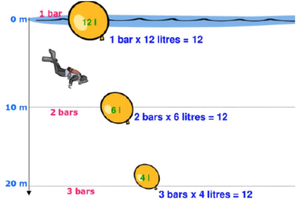 La loi de Boyle/Mariotte énonce que la pression d’un gaz est inversement proportionnelle à son volume, à une température constante. Prenons l'exemple d'un ballon de baudruche de 12 litres gonflé et fermé. Si nous l’immergeons à 20 mètres de profondeur, que se passe-t-il ? Le ballon va rétrécir car la pression ambiante est plus élevée à cette profondeur qu’à la surface.
