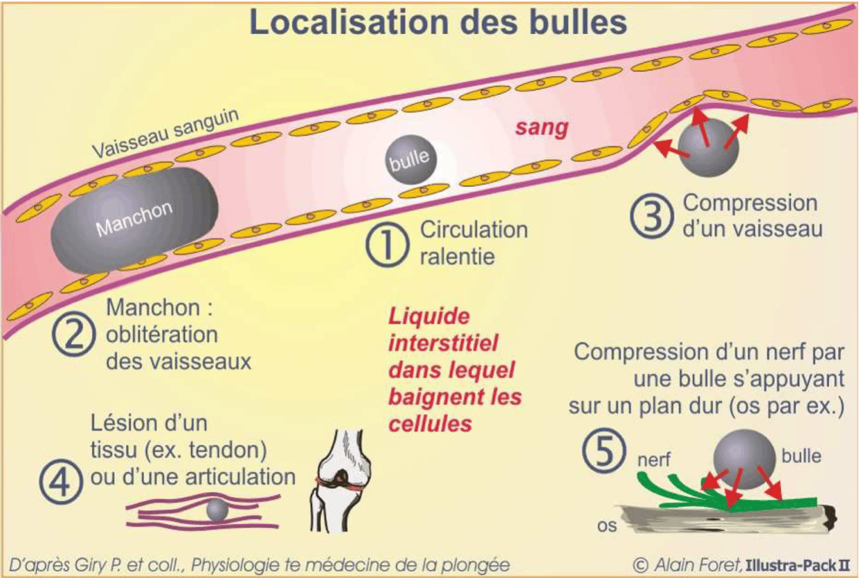 À la remontée, l’Azote va former des microbulles qui vont être éliminées par le filtre pulmonaire. Si la remontée est rapide ou si les paliers sont mal effectués, la bulle peut devenir trop grosse, favorisant un ADD.