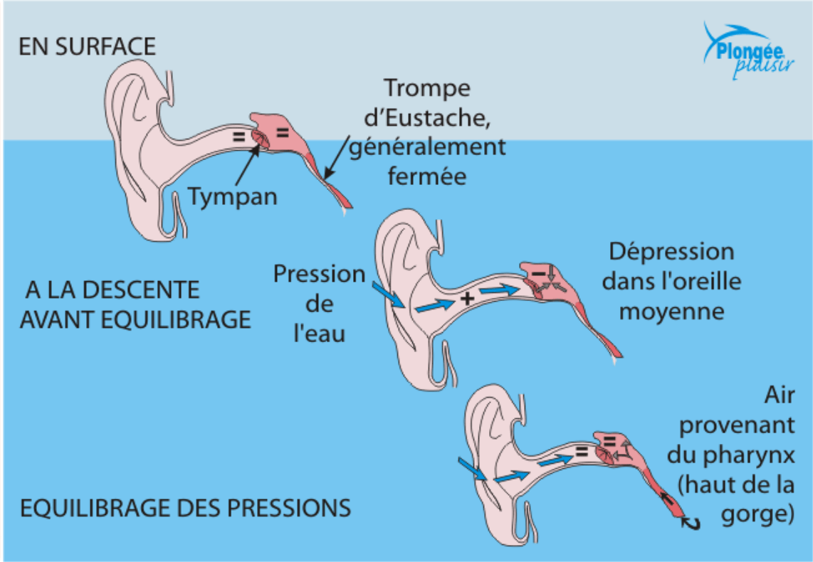 Durant la remontée, la pression à l’extérieur de notre oreille va diminuer, notre tympan va se creuser vers l’extérieur, l’équilibrage se fait tout seul; Attention pas de Vasalva à la remontée !