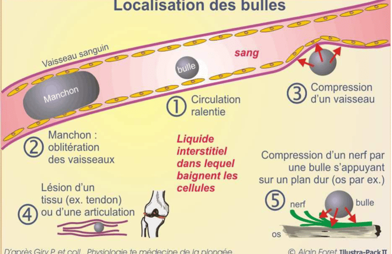 Notre corps va donc se décharger en Azote. Si ce dernier se décharge trop rapidement, le surplus d’azote se transformera en petites bulles d’air, responsables d’accidents de désaturation plus ou moins grave selon l’emplacement de celles-ci.