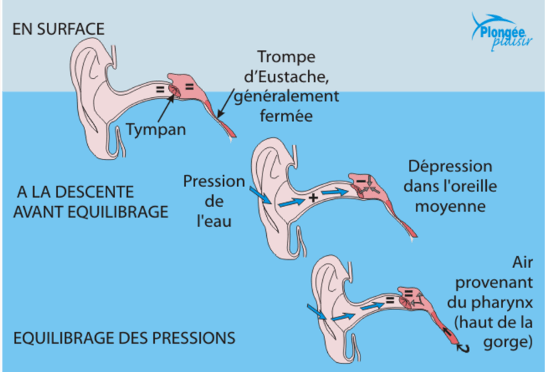 Durant la descente, la pression à l’extérieur de notre oreille va augmenter, notre tympan va se creuser vers l’intérieur et nous allons ressentir une gêne. Il va donc falloir équilibrer :
